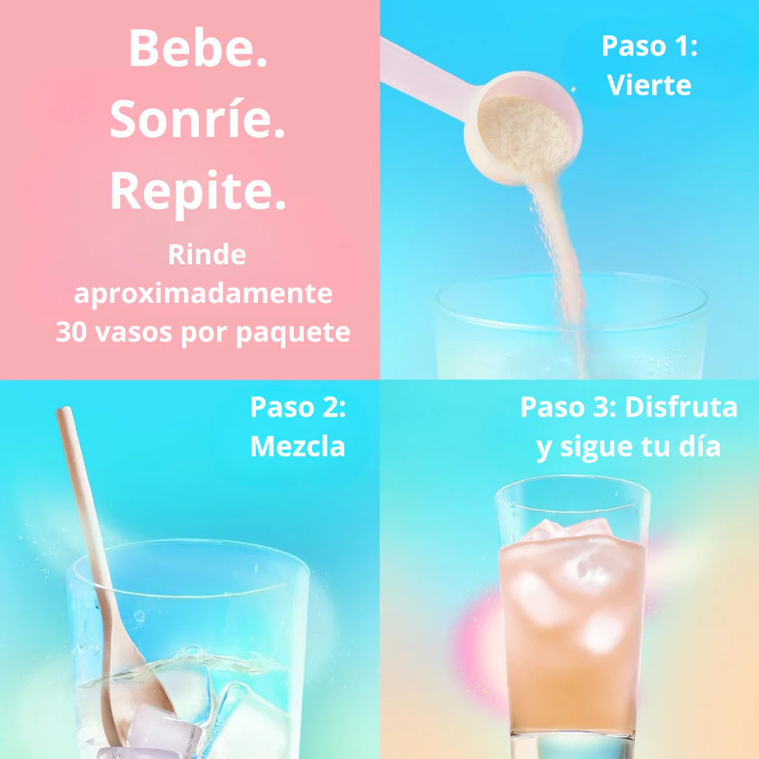 Solo debes mezclar una porción del polvo en un vaso de agua fría o caliente, remover bien y disfrutar. También puedes prepararlo con hielo para una bebida refrescante.